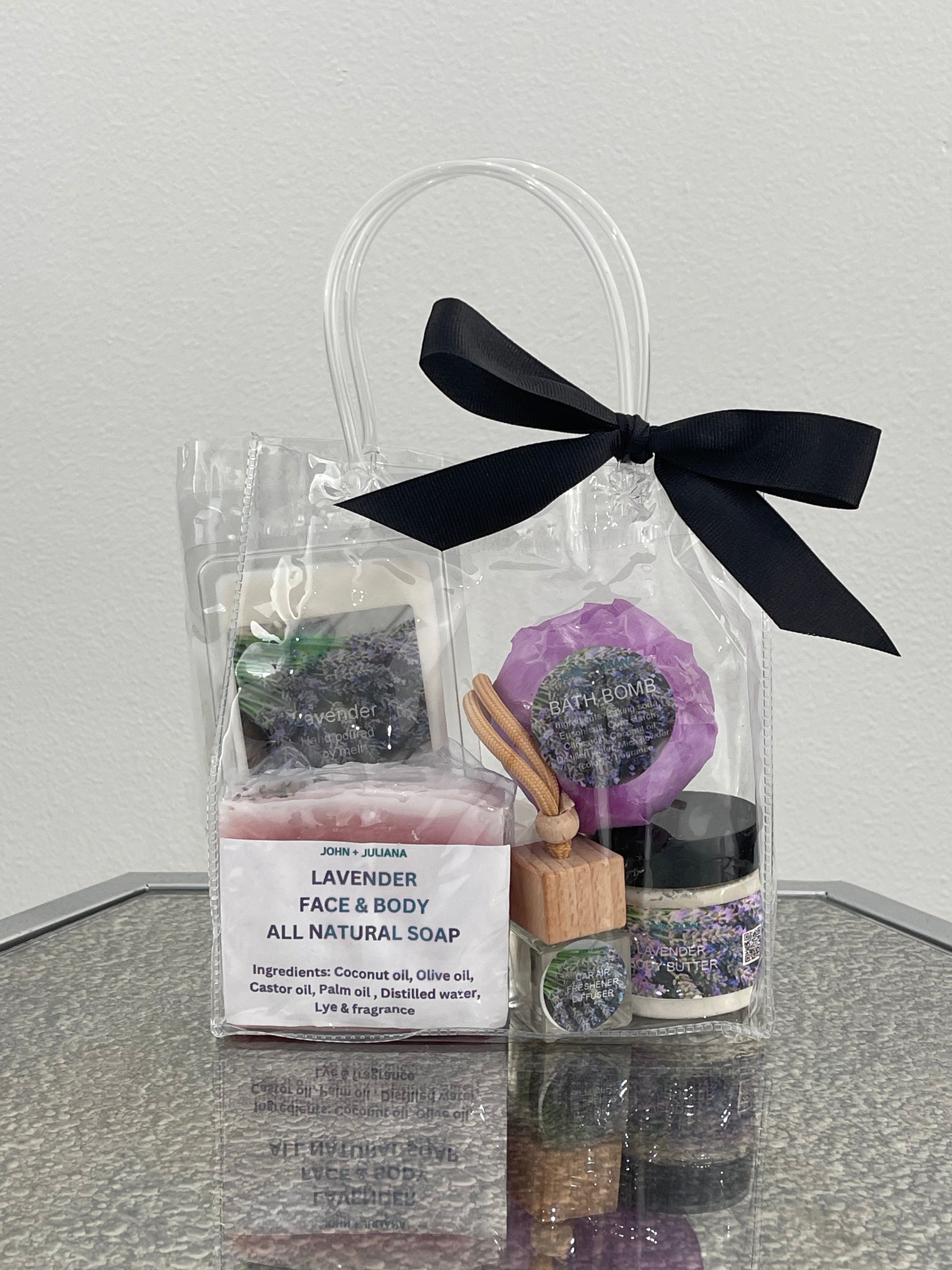 Bag contains : 1 Soap, 1 Soy wax melt, 1 bath bomb, 1 2 oz body butter, 1 Car diffuser